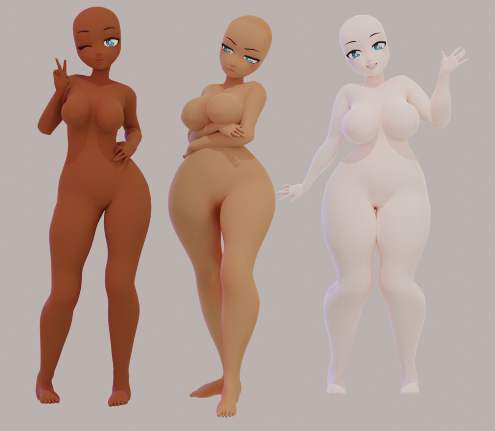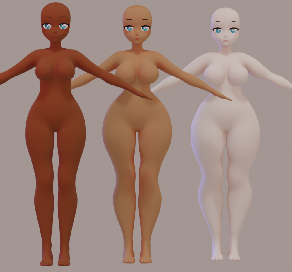 A free to use anime base. Her hands and feet are kinda wonky but She's cute! I made 3 body types and 3 skin tones to start you off and edit from. Body and face at 22k tris.